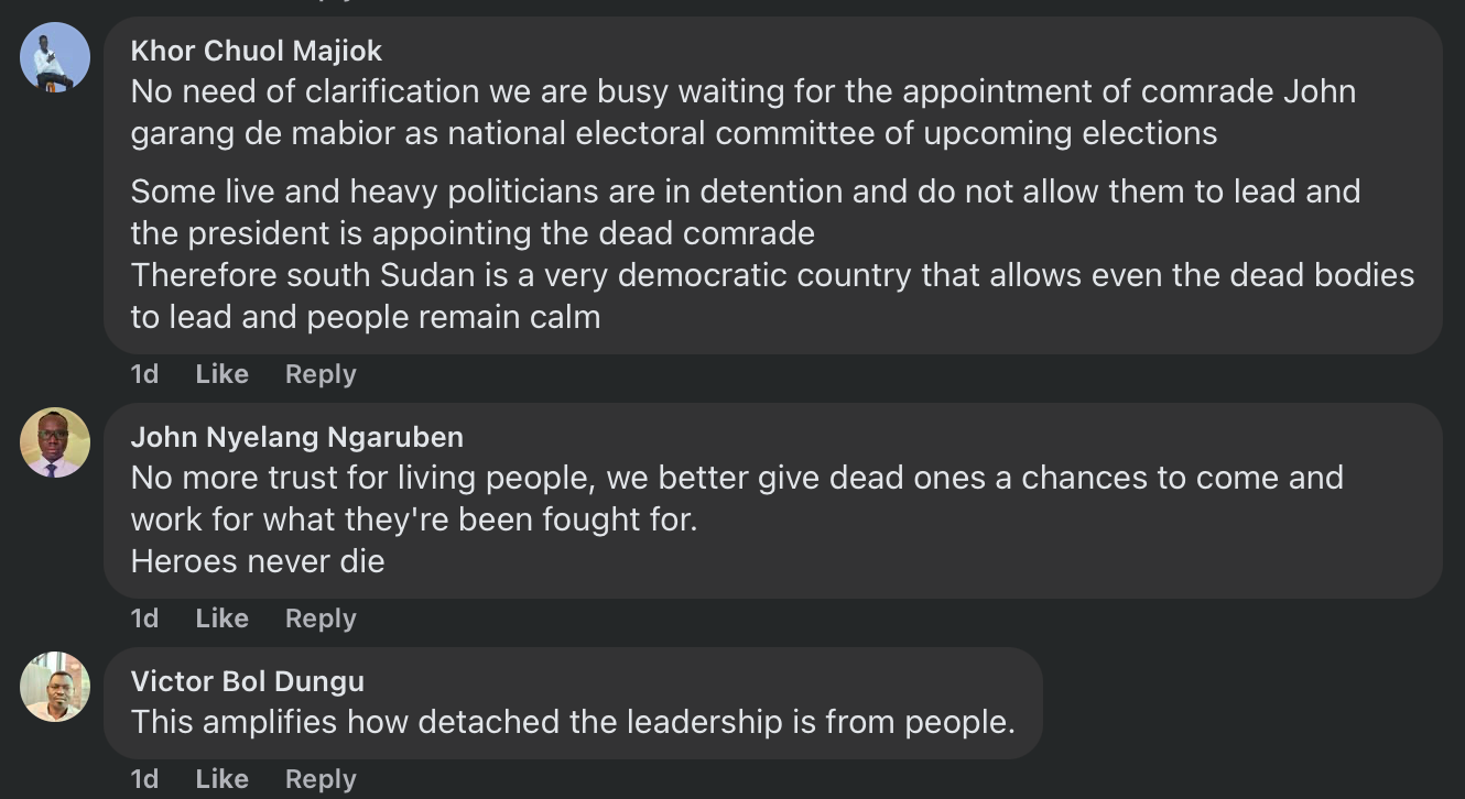 South Sudanese politicians in Kiir’s party have grown accustomed to being appointed and fired without advance notice or consultation. However, appointees are generally known to be alive and politically active; this is the first time that the president has appointed a dead man.