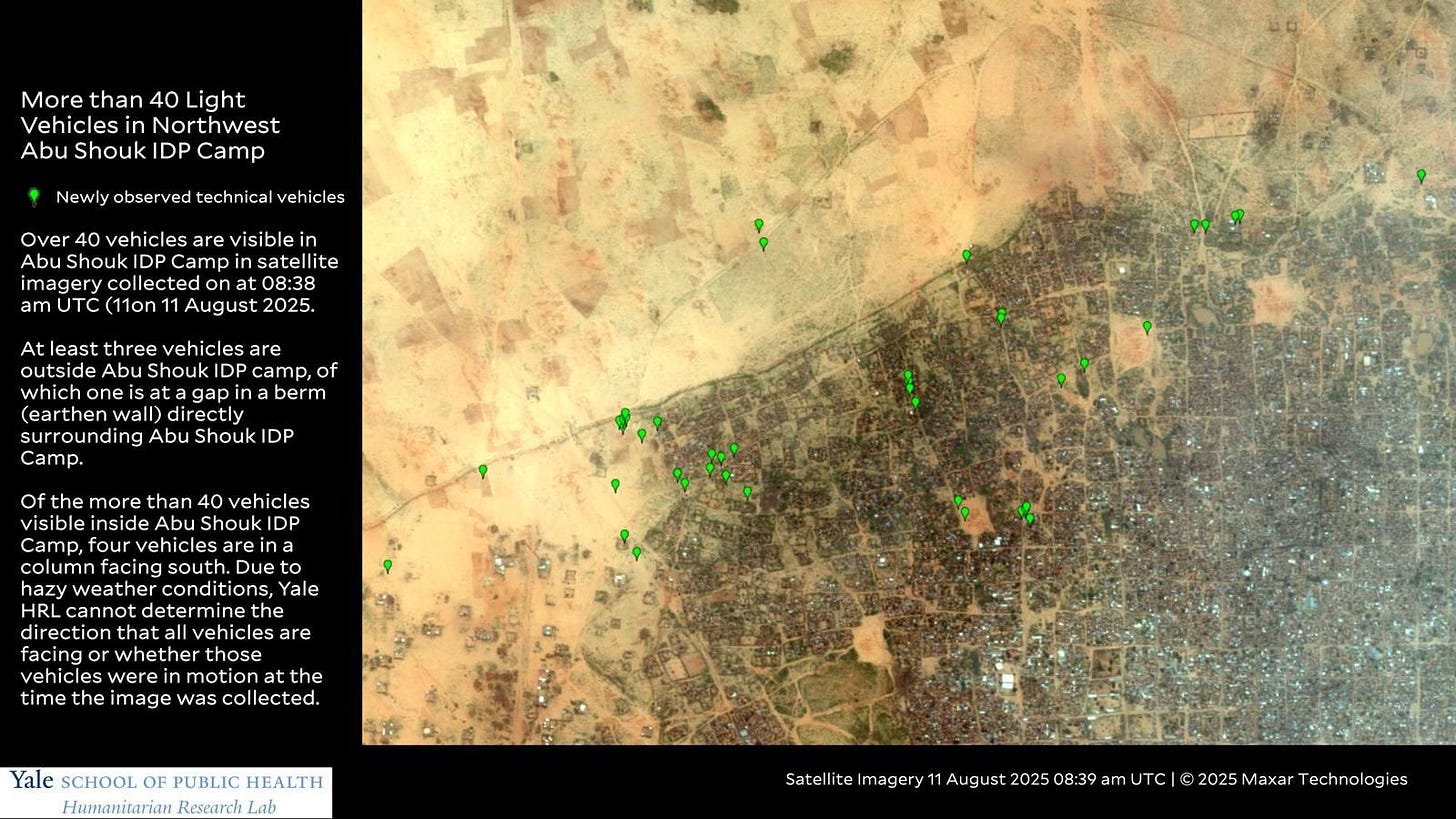 Yale Humanitarian Research Lab, which has been tracking the conflict, analyzed satellite images of Abu Shouk Camp taken during the fighting yesterday. In a report, the Yale researchers said that they identified 40-plus light vehicles throughout northwest Abu Shouk IDP Camp, consistent with reports of an RSF attack. The report also noted the appearance of roadblocks using tire pylons on roads leading from El Fasher north toward Melit and Kutum, illustrating RSF control of these escape routes.