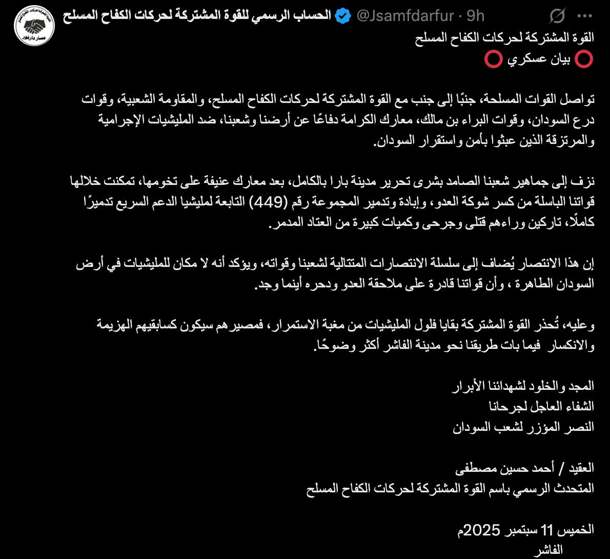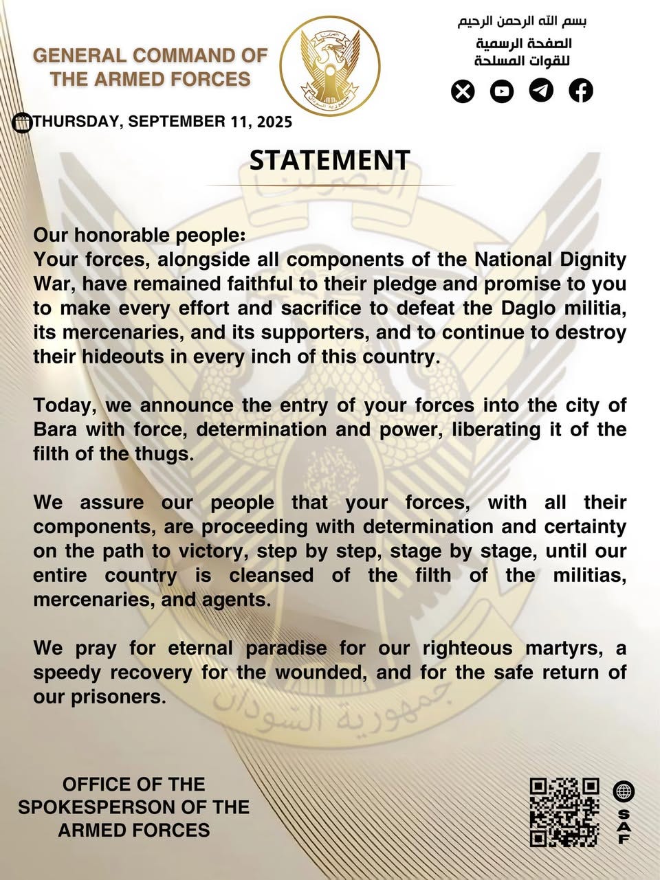 “The Armed Forces, together with the Joint Force of the Armed Struggle Movements, the Popular Resistance, the Sudan Shield Forces, and the Bara bin Malik Forces, continue the battles of dignity in defense of our land and our people against the criminal militias and mercenaries who have undermined Sudan’s security and stability.”