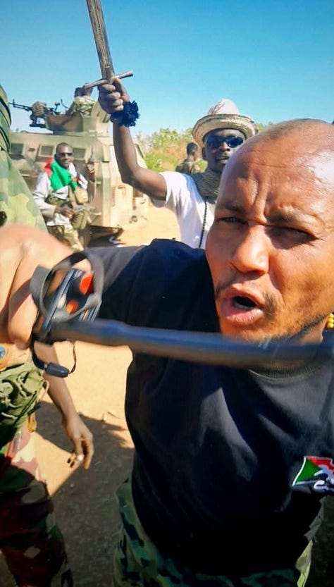 In this video, Abu Aqla Keikel, flanked by Farat Wad al-Omda of the Bara Bin Malik forces, is seen addressing a group of soldiers shortly after the town’s capture.