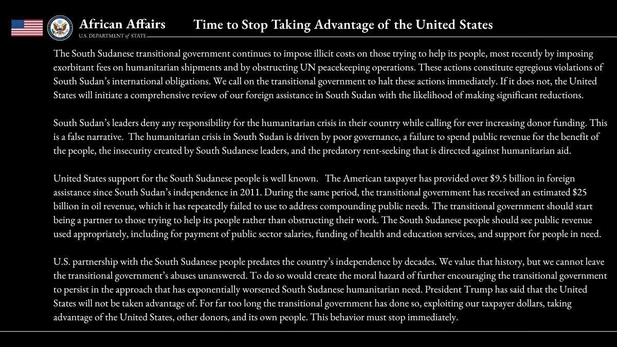 The U.S. Bureau of African Affairs at the Department of State issued a scathing statement against the South Sudanese government, accusing it of wasting oil revenues, extorting aid workers, exorbitantly taxing humanitarian shipments, and obstructing UN peacekeeping operations: