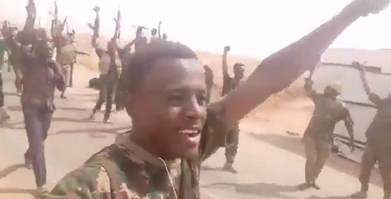 In this video, SAF soldiers from the 5th Infantry Division are seen driving east of El Obeid toward Jebel Kordofan to link up with their counterparts from the 18th Infantry Division and the Al Sayyad mobile forces (13°8'37.38"N, 30°15'57.86"E).