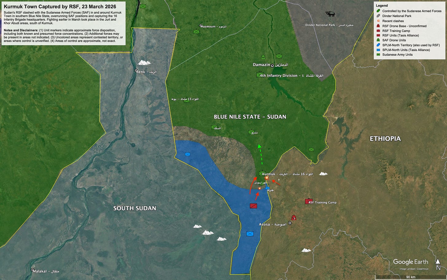 Tasis Alliance forces captured the town of Kurmuk in southeastern Blue Nile State yesterday, 23 March 2026, scattering army units, plundering supplies and equipment, and taking prisoners, including senior army officers.