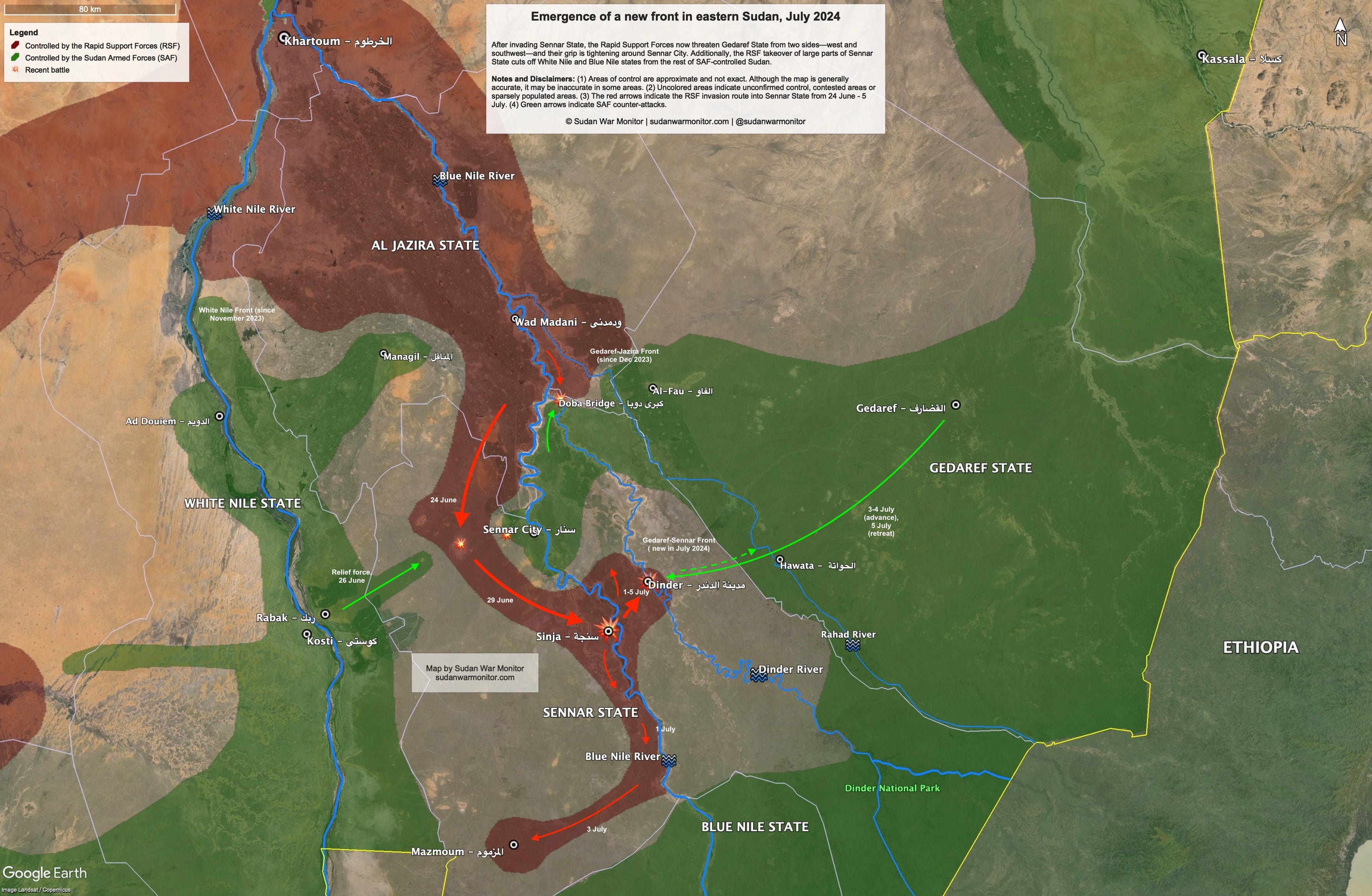 Back-and-forth fighting took place over the past three days in Dinder, a small city located 25 km northeast of the Sennar State capital Sinja. RSF took control of the city and its bridge on July 1-2, shortly after the fall of Sinja.