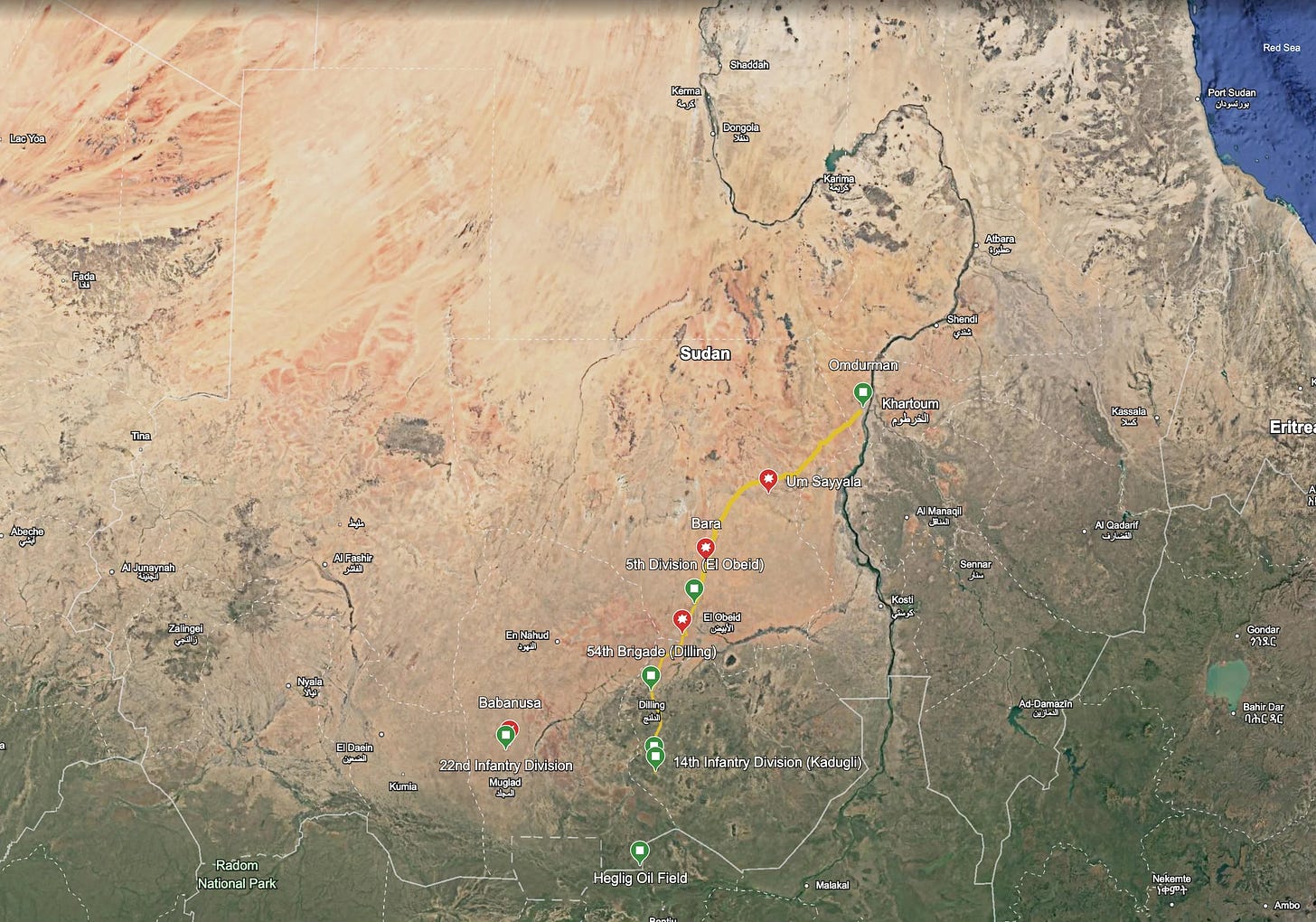 The Sudanese military and its allies on Monday and Tuesday pushed west from White Nile State toward Umm Sayyalla while other units advanced northward from El Obeid and Umm Dam locality into Bara, entering both towns briefly. These two simultaneous operations suggest a coordinated effort to reopen the road between El Obeid and Omdurman/Khartoum. Videos reviewed by Sudan War Monitor show Joint Force and Sudan Shield fighters arriving on the outskirts of the two towns.