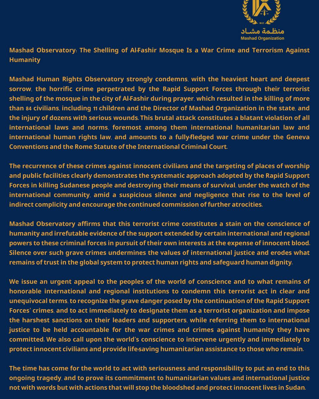 “This brutal attack represents a blatant violation of all international laws and norms, foremost among them international humanitarian law and the Geneva Conventions … It constitutes a fully-fledged war crime,” the statement read, accusing regional and international powers of complicity through silence, and called for the RSF to be formally designated a terrorist organization.
