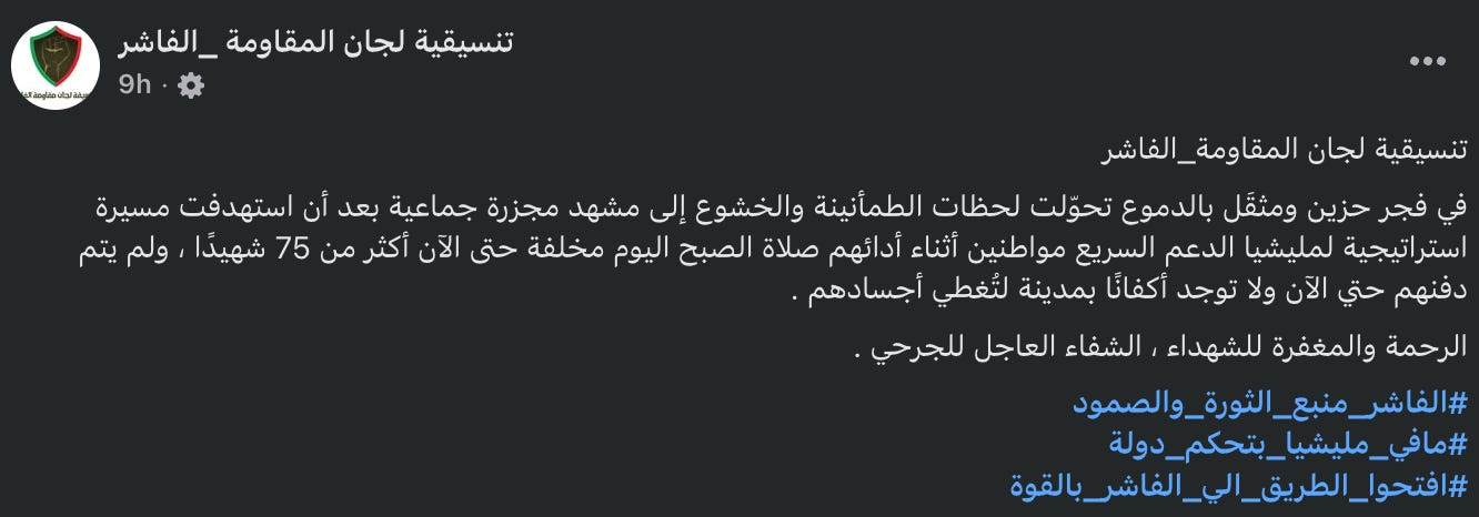 “At a sorrowful, tear-filled dawn, moments of calm and devotion turned into a scene of mass slaughter after a strategic convoy of the Rapid Support Militia struck civilians while they were performing the dawn prayer … leaving more than 75 martyrs. Their bodies have not yet been buried and there are no shrouds in the city to cover their corpses,” the committee said in its first statement reviewed by Sudan War Monitor.